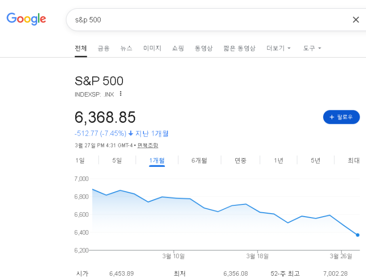 S&P 500 최근 1달동안 계속 떨어지고 있는 추세입니다.